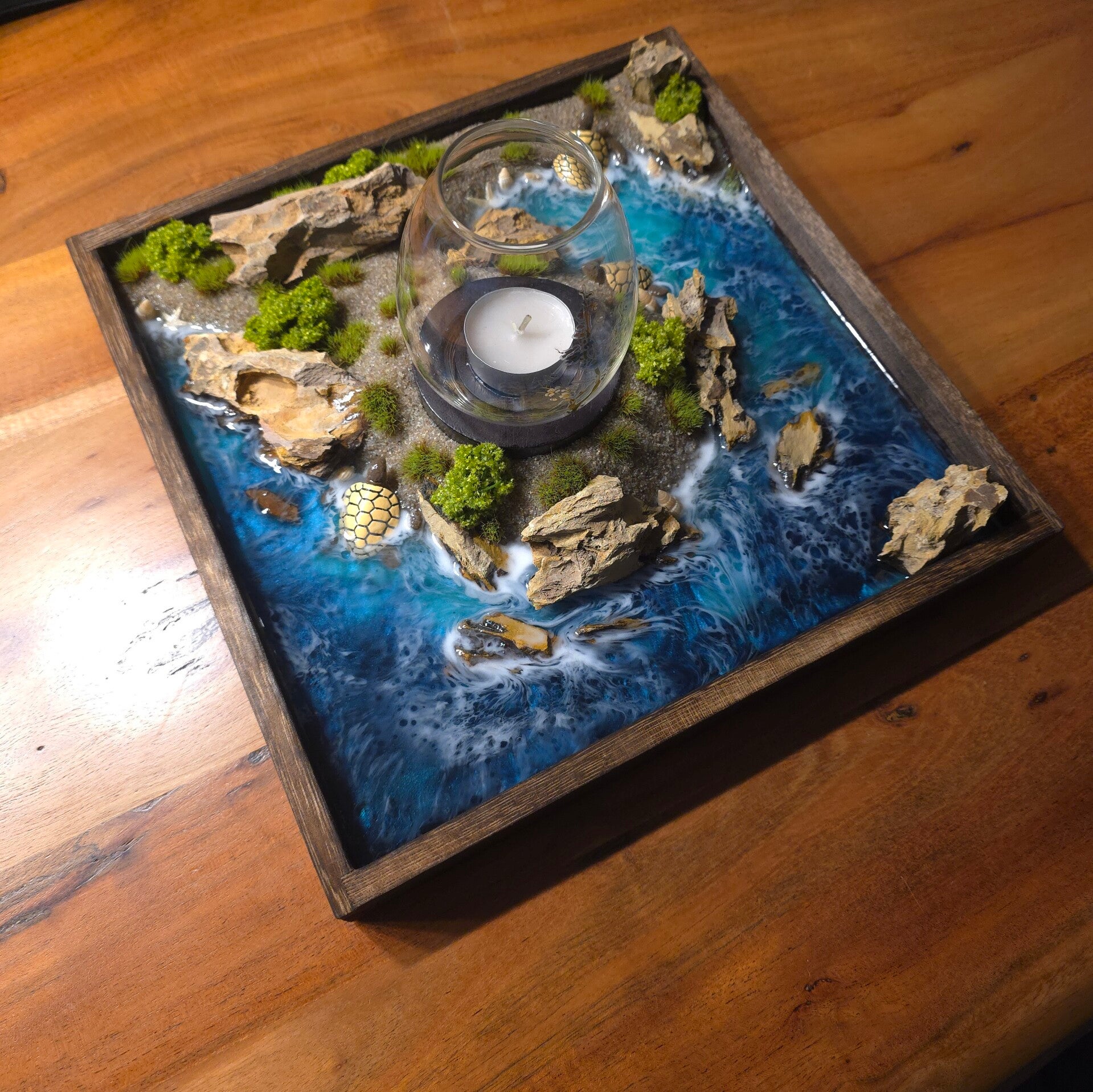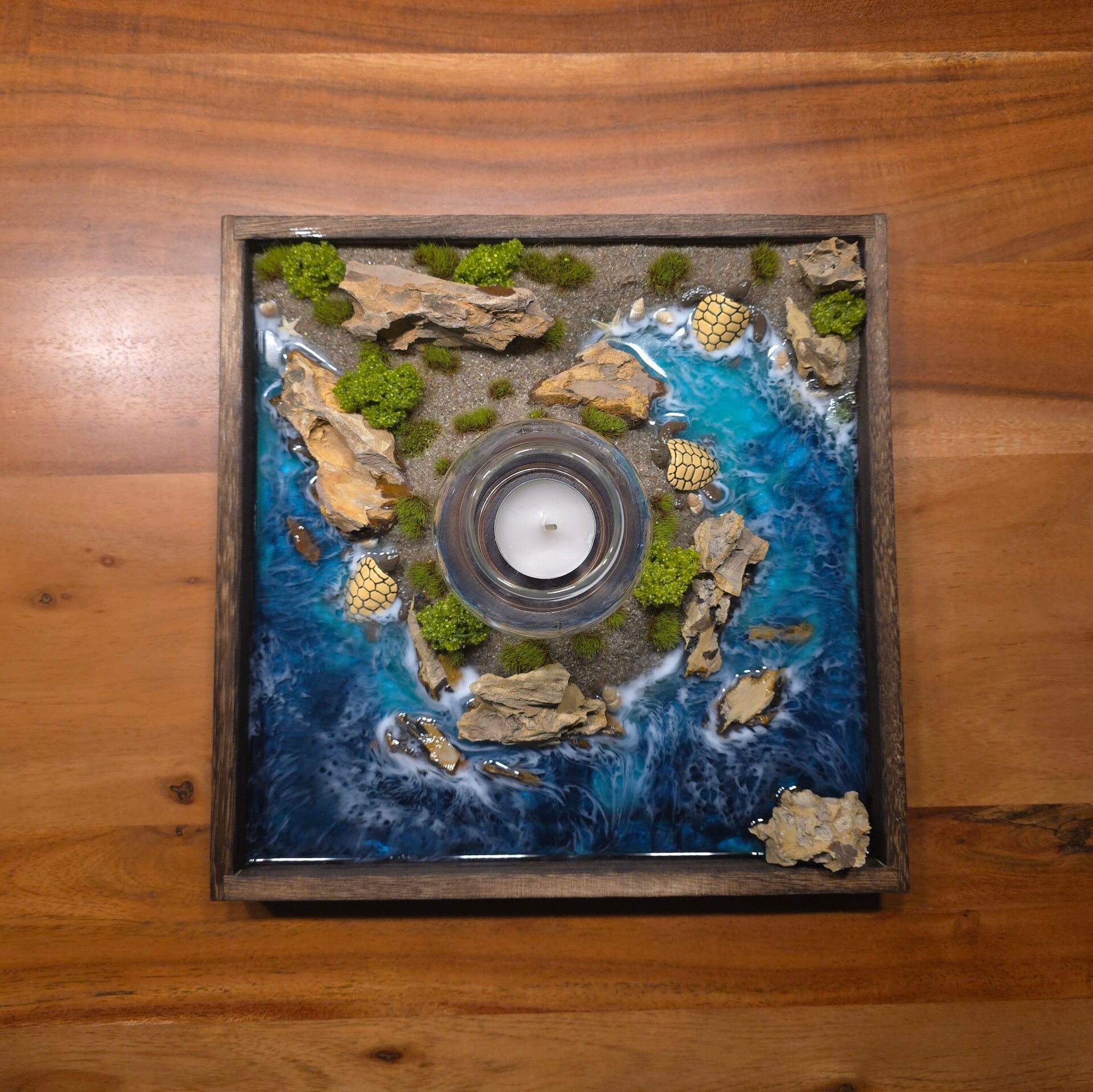 - Epoxidharz Ocean Teelicht Set mit dunkelbrauner Holzoptik